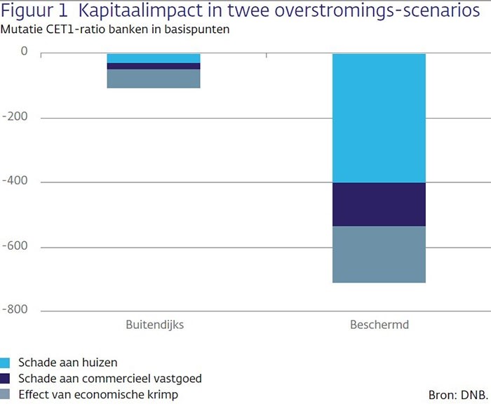De financiële kwetsbaarheid zit volgens DNB vooral bij die delen van Nederland die beschermd zijn door dijken, maar waar dan ook relatief veel vastgoed staat. “Als op enig moment daar een overstroming optreedt, kan dit ook de bankensector raken. De figuur laat zien, dat het effect op banken snel toeneemt met de zwaarte van de overstroming. De kapitaalpositie van banken kan in een extreem scenario rond de 7 procentpunt dalen, wat zelfs voor een stresstest een stevige uitkomst is.”