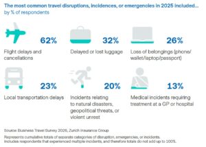Vier op de vijf respondenten (80%) hebben in 2025 minstens één verstoring ervaren tijdens een zakenreis, en meer dan de helft kreeg te maken met een incident of noodsituatie tijdens een zakenreis. Dat is één van de uitkomsten van Zurich’s ‘Business Travel Outlook 2026 onder 4.000 internationale zakelijke reizigers op vijf continenten en in acht landen. Het onderzoek laat zien dat verstoringen de norm zijn geworden.