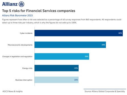 Cyberincidenten zijn het grootste algemene risico voor bedrijven en de tactiek van criminelen verandert. Martin Zschech, Global Industry Solutions Director for Financial Services bij AGCS, zegt: “Ondanks dat de respondenten elk jaar aanzienlijk investeren in cyberbeveiliging, zien zij de financiële sector als zeer kwetsbaar. De belangrijkste bedreiging voor financiële instellingen is de poging om de activa die zij bezitten weer in bezit te krijgen. Dit kan op verschillende manieren gebeuren – bijvoorbeeld door zich voor te doen als iemand anders, door een cyberaanval of door vervalste elektronische correspondentie.” De banksector alleen al kende een toename van 1.300%+ in ransomware-aanvallen in 2021, volgens rapporten.