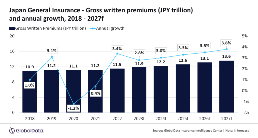 Uit de Insurance Database van GlobalData blijkt dat de Japanse algemene verzekeringssector in 2023 naar verwachting met 2,8% zal groeien, ondersteund door een stijging van de autoverkoop, nieuwe infrastructuurprojecten, een toenemende vraag naar polissen die schade door natuurrampen (NatCat) dekken, en toenemende gevallen van cyberaanvallen. .