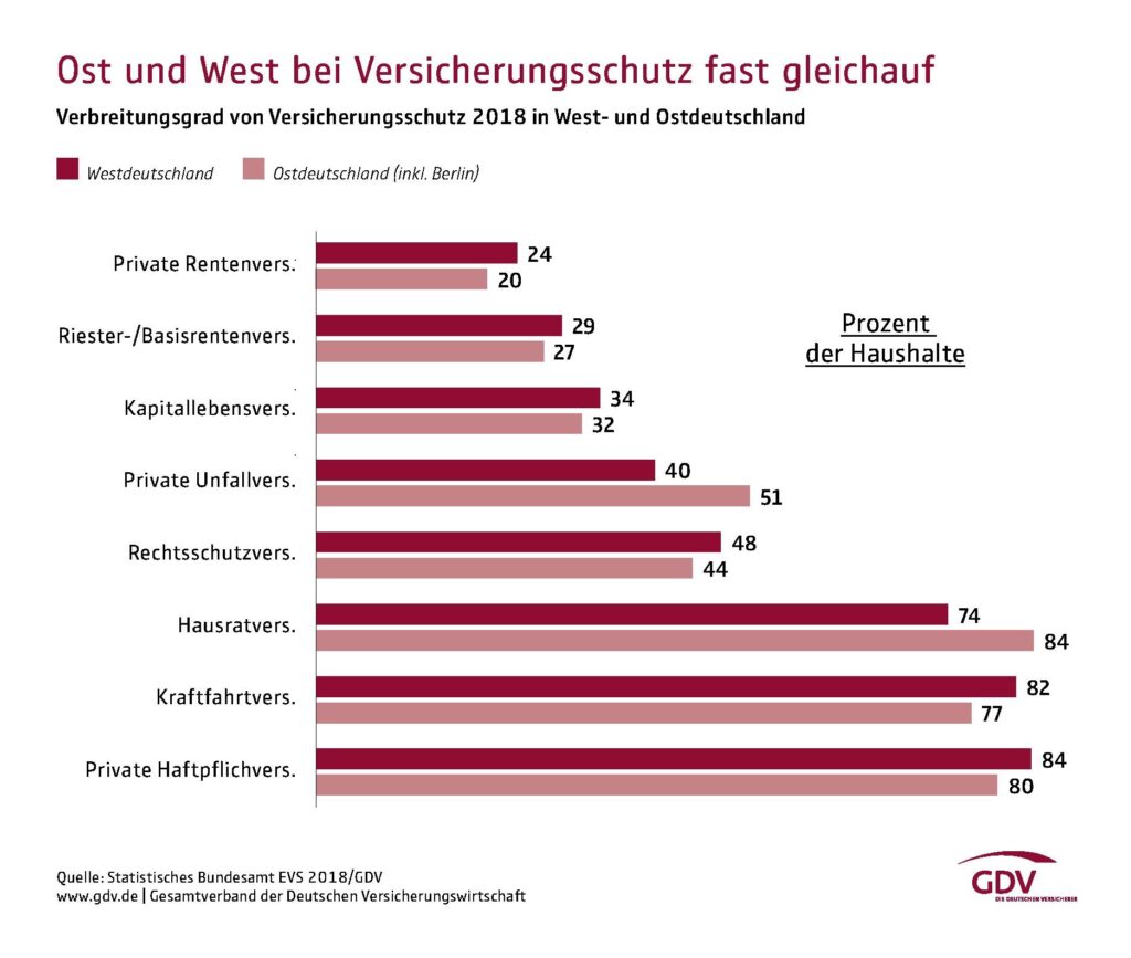 | Zelfs 30 jaar na de hereniging zijn de economische verschillen tussen Oost- en West-Duitsland op veel plaatsen nog altijd voelbaar. Als het echter om verzekeringsdekking gaat, liggen het voormalige Oost- en West-Duitsland zeer dicht bij elkaar, zo blijkt uit een analyse van het Duitse Verbond van Verzekeraars GDV. Van de acht onderzochte verzekeringsbranches verschilt de penetratiegraad van verzekeringen tussen ‘West’ en ‘Oost’ (incl Berlijn) slechts bij twee meer dan 5%; ongevallenverzekeringen (40 vs 51%) en inboedelverzekeringen (74% vs 84%). Overigens is de verzekeringsdichtheid bij de meeste schadeverzekeringen het hoogst in het voormalige ‘DDR” en die voor levensverzekeringen en pensioenen daarentegen in het vroegere West-Duitsland. In beide regio’s gezamenlijk is de verzekeringsdichtheid het hoogst bij AVP-verzekeringen (84% vs 80%), gevolgd door autoverzekeringen (82% vs 77%), en inboedelverzekeringen (74% vs 84%). Op ruime afstand volgen rechtsbijstandverzekeringen (48% vs 44%), particuliere ongevallenverzekeringen (40 vs 51%), kapitaallevensverzekeringen (34% vs 32%), de zogeheten Riester/Basispensioen-verzekeringen (29% vs 27%) en de Private pensioenverzekeringen (24% vs 20%). Er zijn volgens het GDV verschillende mogelijke verklaringen voor de verschillende verzekeringsdichtheden. Zo hebben inkomens- en vermogensverschillen tussen de deelstaten een impact, maar ook demografische factoren. Zo hebben kleinere en / of jongere huishoudens doorgaans minder verzekeringen – in Bremen heeft slechts 28% van de huishoudens een particuliere ongevallenverzekering, in Berlijn (32%) en Hamburg (34%). In Oost-Duitsland heeft de soms hoge verzekeringsdichtheid ook historische redenen. Zo zullen sommige verzekeringscontracten van de voormalige Deutsche Versicherungs-AG van de DDR waarschijnlijk blijven bestaan voor inboedel- en ongevallenverzekeringen. De GDV-evaluatie van verzekeringsdichtheden is gebaseerd op de steekproef van inkomsten en uitgaven (EVS) van het Federaal Bureau voor de Statistiek, waarvoor 60.000 huishoudens werden ondervraagd. |
