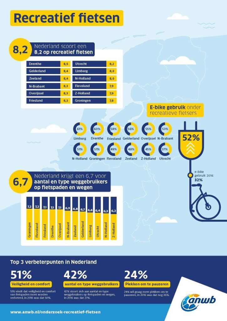 De beste provincie om te fietsen is Drenthe (8,5). Op een gedeelde tweede plaats volgen Gelderland en Zeeland met een 8,4. De provincies Overijssel, Friesland en Noord-Brabant delen de derde plaats (8,3). Het recreatief fietsen wordt gemiddeld met een 8,2 beoordeeld. Dit is hoger dan in 2016 toen de waardering een 8,0 was.